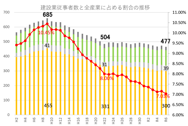建設業界では人手不足が深刻化しており、2025年現在、就業者数はピーク時の約685万人から約477万人まで減少しています。