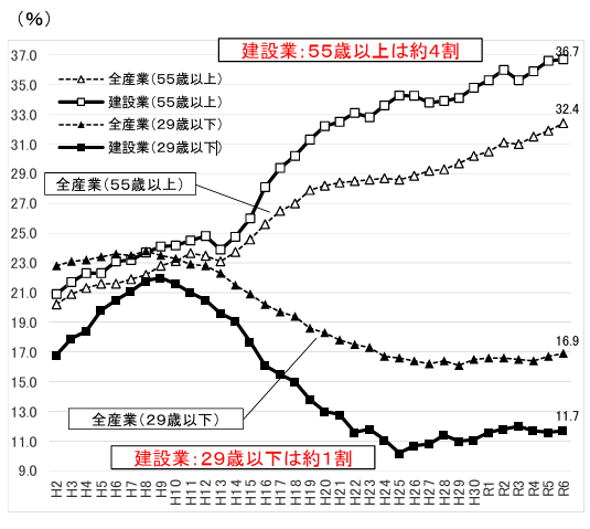 国土交通省のデータによると、令和6年において55歳以上の就業者が全体の約40%を占め、若年層(29歳以下)は10%前後にとどまっています。